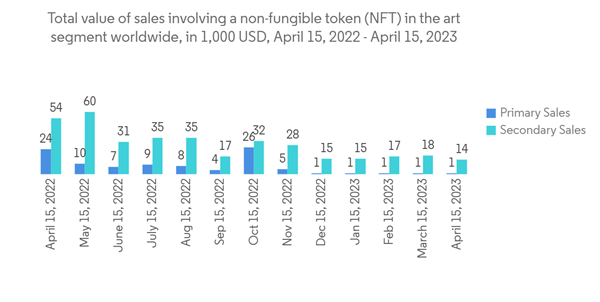 - The increasing usage of blockchain in financial applications such as cryptocurrencies and NFTs will drive Tokenization in the studied period. For instance, the total value of sales involving non-fungible tokens (NFTs) in the art area fluctuated wildly between April 15, 2022, and April 2023.